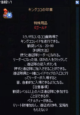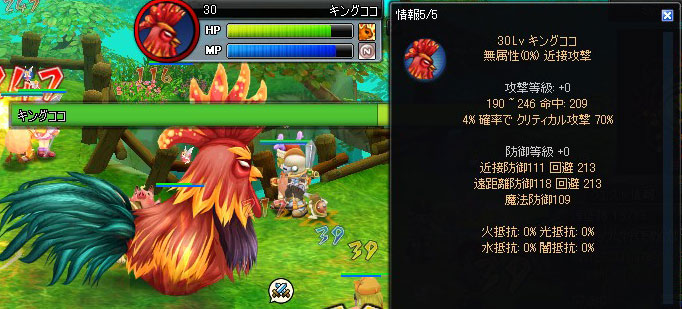 ボス戦中にキングコケッコが飛び上がった直後、↑のSSのような赤円が出ます。攻撃に夢中になって、この円に気づかずにいると、上からキングコケッコが落ちてきてHP90%以上持っていかれます。そのため、常にHPは満タン状態にしておく必要があります。POTをケチっていると簡単に逝けます。