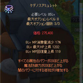 今度は残念ながらMPUPは付いてくれませんでしたが、HPUPは付いたし、MP消費量減少も最大値が付いたので十分使えるかなーと思うことにしました。